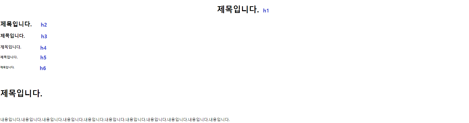 - h1, h2, h3, h4, h5, h6 >> ์ ๋ชฉ์ ์ค์๋๋ฅผ ๋ํ๋ธ๋ค.