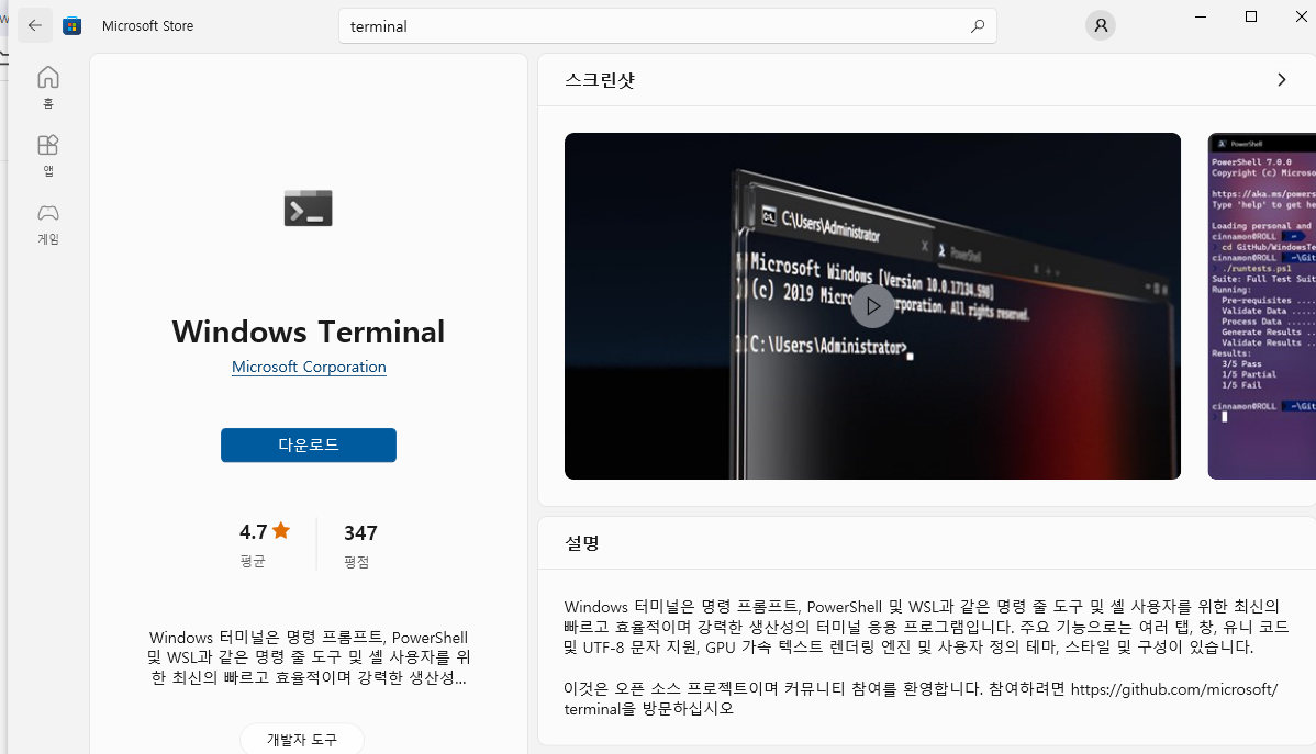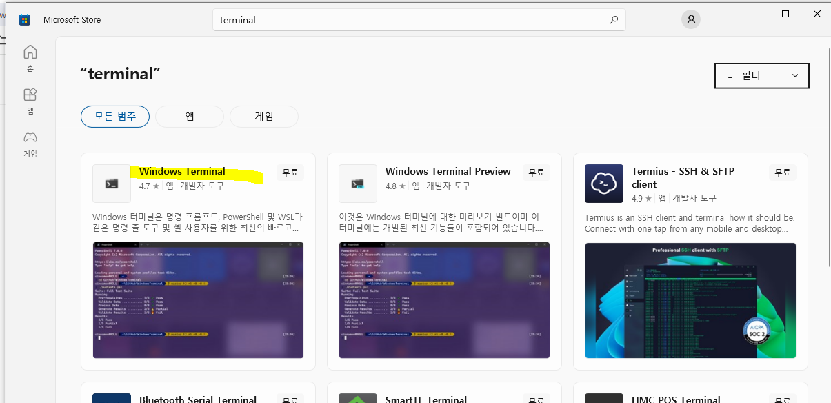 2. terminal 검색 후 'Windows Terminal' 설치