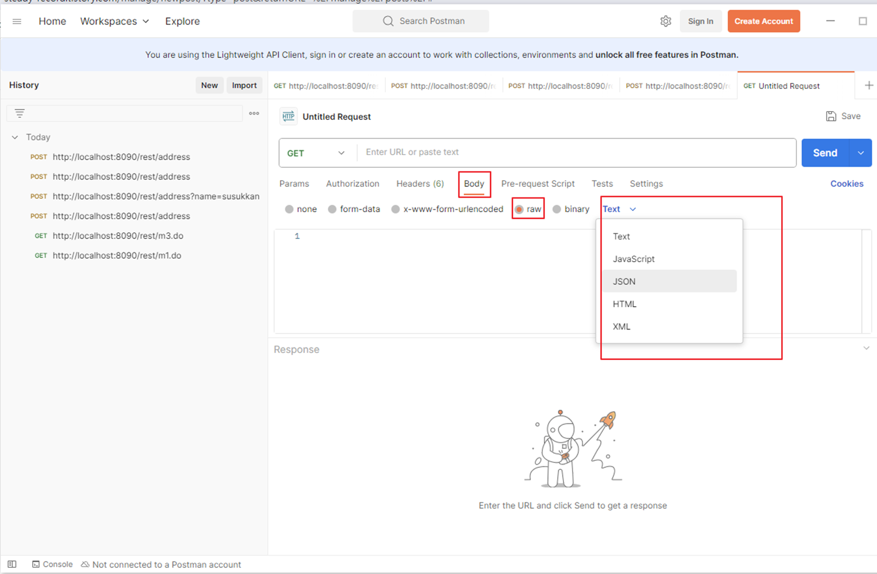 Body 탭 - raw - Text 중에서 JSON 선택