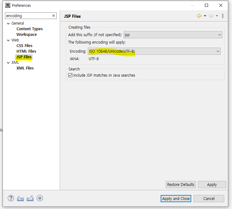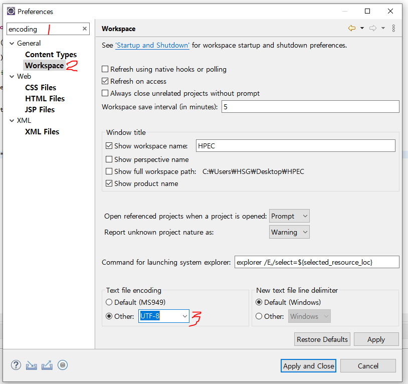 'encoding'์ผ๋ก ๊ฒ์ ํ workspace ๋ด Text file encoding์ 'UTF-8'๋ก ๋ณ๊ฒฝํด์ค๋ค.