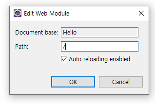 context root๋ฅผ ์์ ํ๋ ค๋ฉด ์ฐ์ธก 'Edit'๋ฅผ ํด๋ฆญํ์ฌ Path ๋ถ๋ถ์ ์์ ํ๋ค.